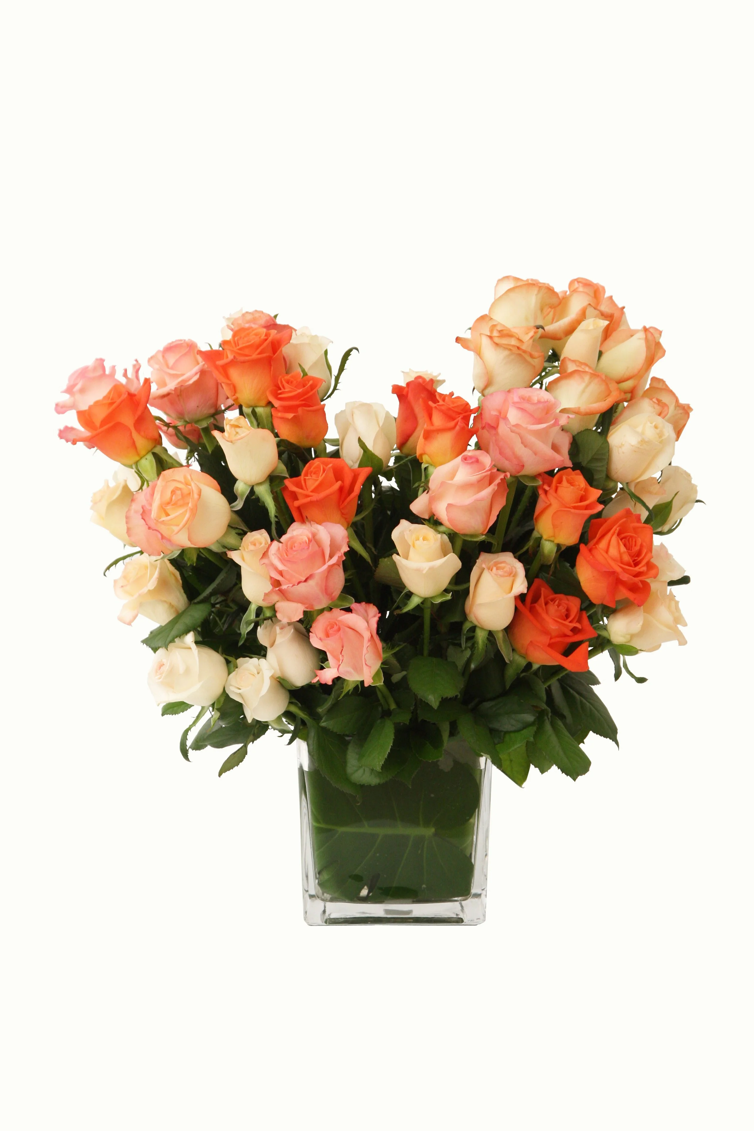 Known as the queen of flowers, an assortment of 60 blooms in coral, cream and orange roses in a cube glass vessel.