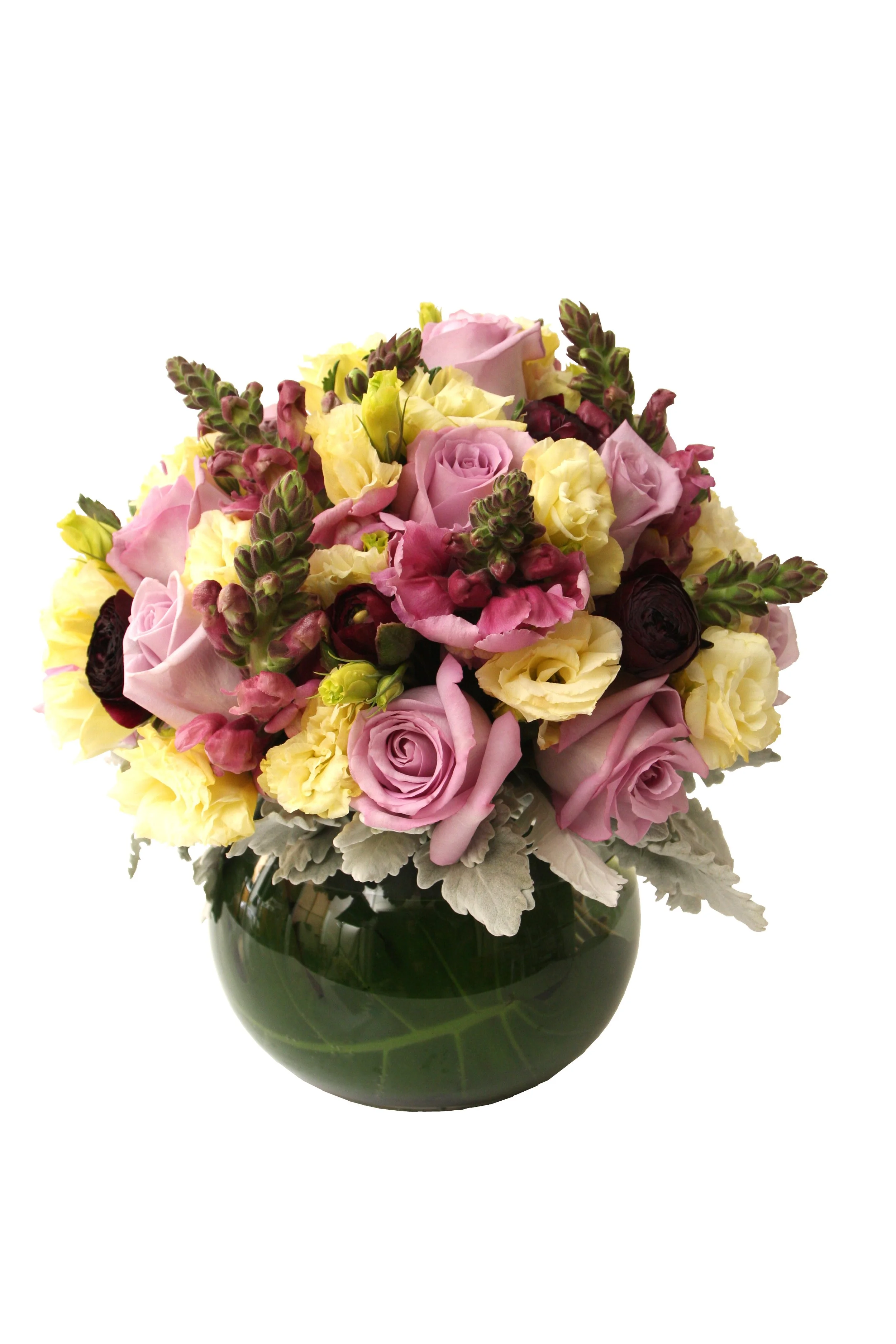 Featuring premium blooms, this mixture of mauve roses, lemon lisianthus, mauve snapdragons and silver suede foliage is arranged in a glass fishbowl. Available in small $150.00, medium $220.00 and large $310.00.